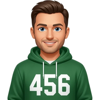 A blond short haired man with green eyes and a black sweatshirt emoji