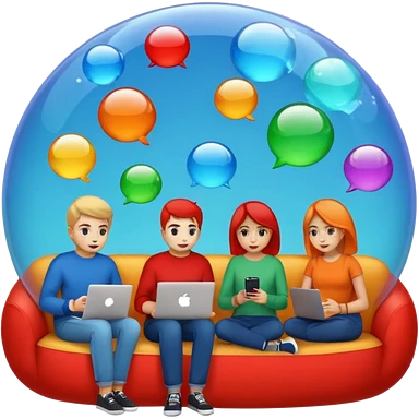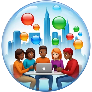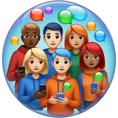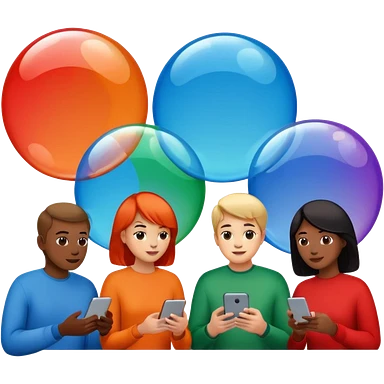 A group of people inside a separate colorful transparent bubble (blue, red, green, orange). They are each holding a smartphone or laptop. the bubbles are slightly overlapping, creating a modern and minimalist look. Realistic emoji style.emoji