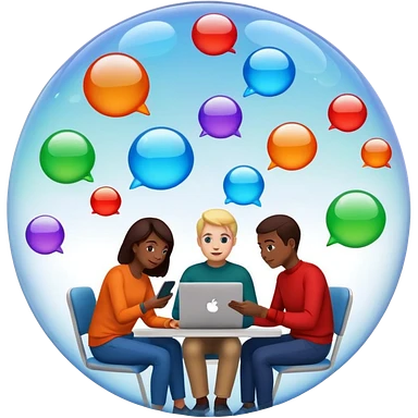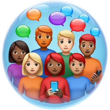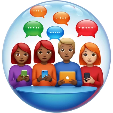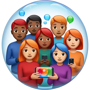 A group of people inside a separate colorful transparent bubble (blue, red, green, orange). They are each holding a smartphone or laptop. the bubbles are slightly overlapping, creating a modern and minimalist look. Realistic emoji style. emoji | AI Emoji Generator
