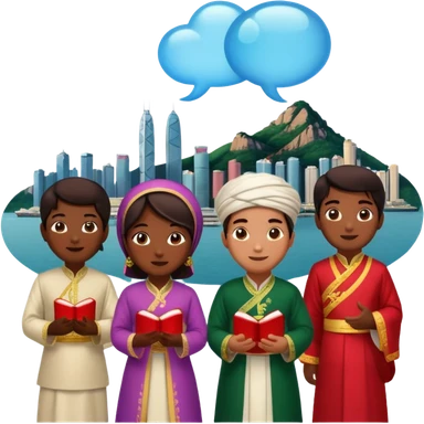 A group of Pakistani people sitting around and sharing knowledge, with talking bubble of Hong kong scenary in it emoji