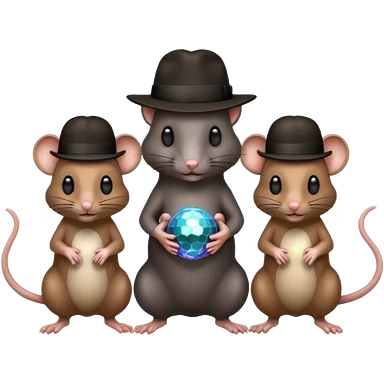 A black rat wearing a fedora standing between two brown rats wearing fedoras holding a disco ball emoji