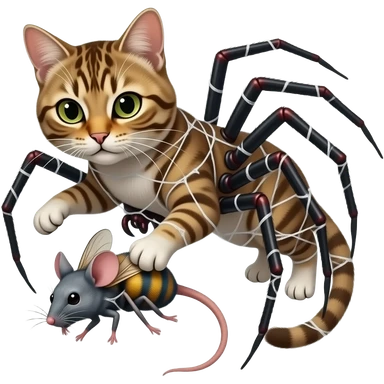 A spider cat hybrid wrapping a mouse fly hybrid wrapped in spider silk in a spider web emoji