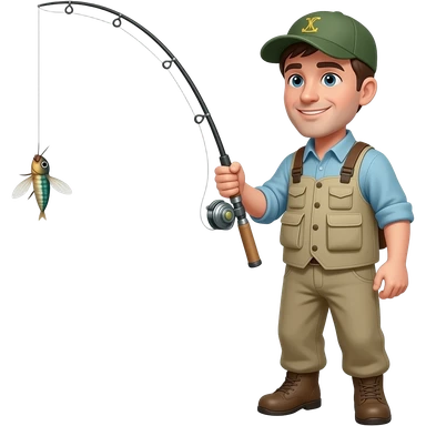 a guy holding a fishing rod with an alive fly on the end flying around emoji