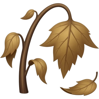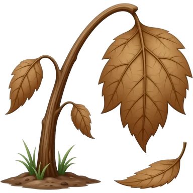 Wilted dead dark brown plantstem from the ground with leafs hanging and a leaf falling to the ground emoji
