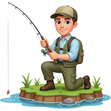a guy fly fishing on his knees on an island into a river with a fly fishing rod emoji