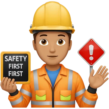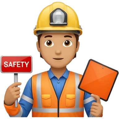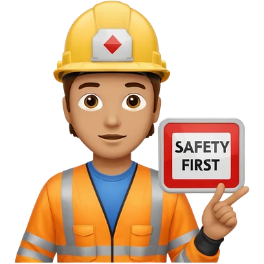 a guy wearing safety outfit with helmet holding a panel written on it SAFETY FIRST emoji