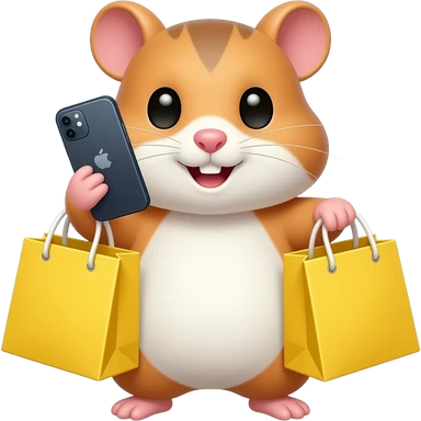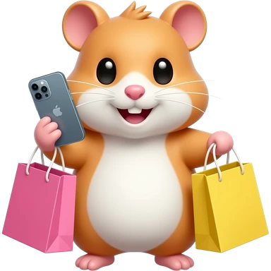 A hamster is talking on an iPhone and holding two shopping yellow bags. emoji