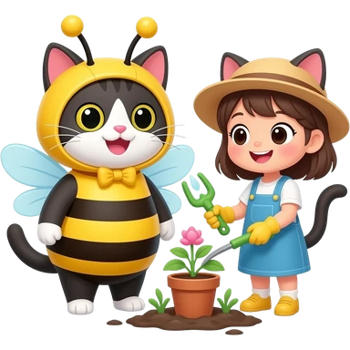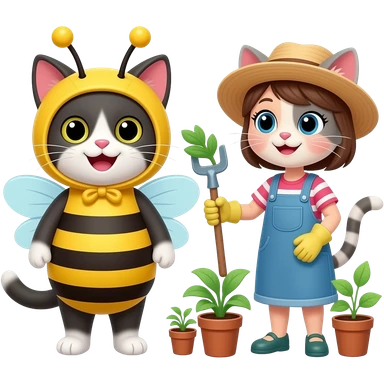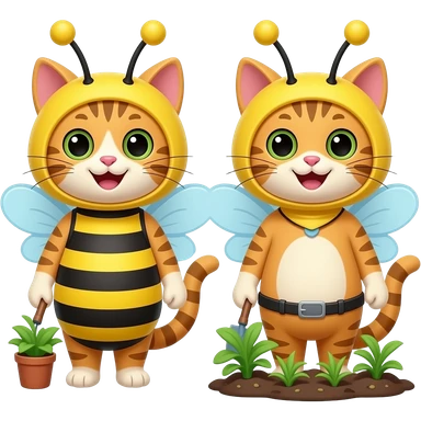 a happy cat dressed as a bee and a happy girl cat gardening emoji