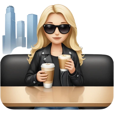 blonde woman with long hair, in black sunglasses, holding a latte in her hand, in jeans and a black leather jacket emoji