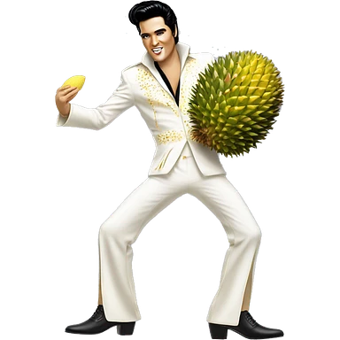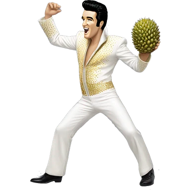 Elvis Presley wearing a white and gold jumpsuit with black shoes in a dancing pose, A hand holding a large durian emoji