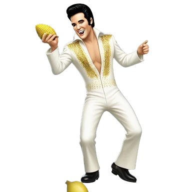 A smiling Elvis Presley wearing a white and gold jumpsuit with black shoes in a dancing pose, A hand holding a large durian emoji