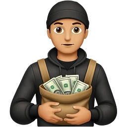 running emoji of a classic burglar, a black eye mask (looks like a blindfold) and a black-and-white striped shirt. emoji-like hair, black hat, ONE bag of money 💰 with a dollar sign in a hand emoji