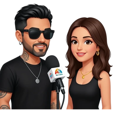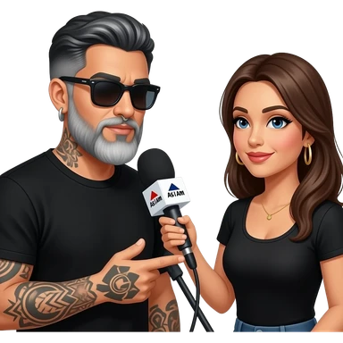 A podcast host who is a handsome Latino man with medium length hair and pretty long beard with some grays and tattoos with a right nose hoop and a left earring hoop wearing all black with a white undershirt and black sunglasses emoji