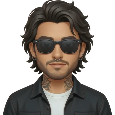 A handsome Latino man with medium length hair and beard and tattoos with a right nose hoop and a left earring hoop wearing all black with a white undershirt and black sunglasses emoji | AI Emoji Generator