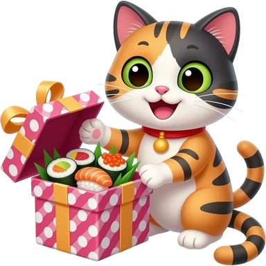 a happy cat opening a birthday present filled with tuna nigiri emoji