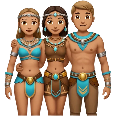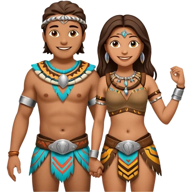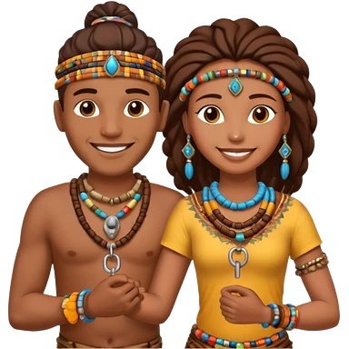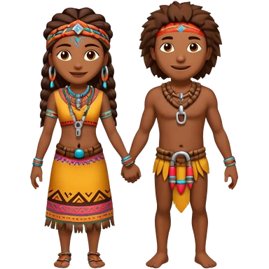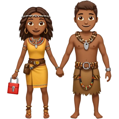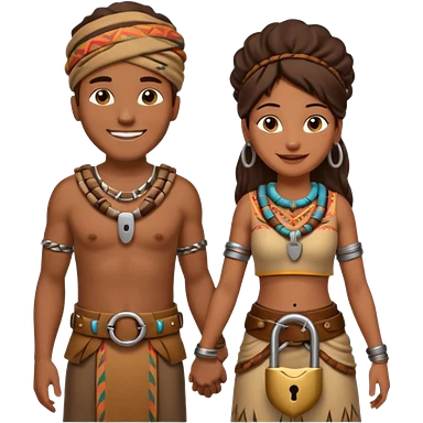 A happy tribal man holding hands with a happy tribal woman wearing a belt with a padlock emoji | AI Emoji Generator