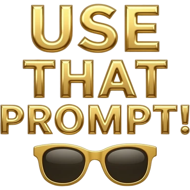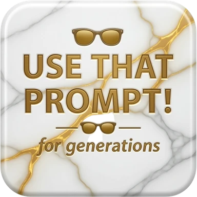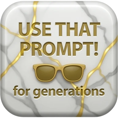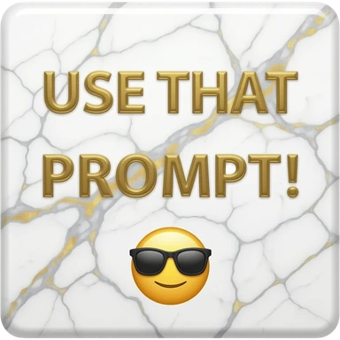 A luxurious uppercase text 'USE THAT PROMPT!' small size text and sunglasses emoji icon 'for generations' crafted from polished white Carrara marble with deep veins of more glowing liquid gold flowing through it. High-end jewelry aesthetic, soft studio lighting, elegant and Luxurious Marble Letter. emoji
