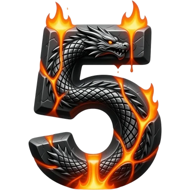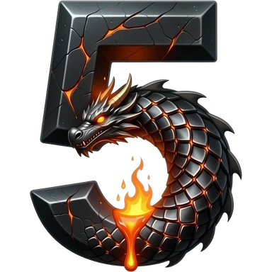 A heavy obsidian letter '5' with molten lava flowing through engraved draconic scales. Emitting orange embers and heat distortion. Dark fantasy aesthetic, metallic texture, dramatic shadows emoji