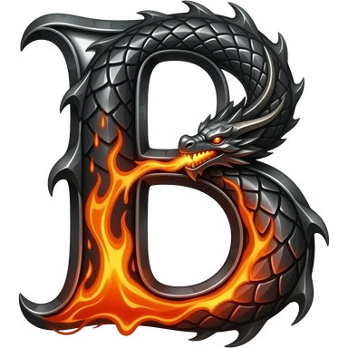 A heavy obsidian letter 'B' with molten lava flowing through engraved draconic scales. Emitting orange embers and heat distortion. Dark fantasy aesthetic, metallic texture, dramatic shadows emoji