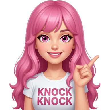 sexy girl with long pink hair and pink eyes wearing a holding a KNOCK KNOCK sign emoji