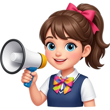 A pretty, fair-skinned high school girl with her hair tied up in a high ponytail, holding a megaphone and wearing a brightly colored bow. emoji