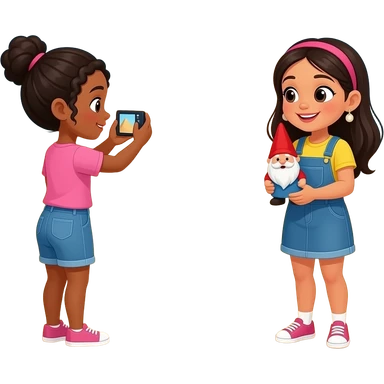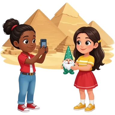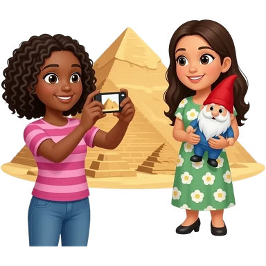 A black girl taking a photo of her Hispanic girl holding a small gnome while standing in front of the pyramids emoji