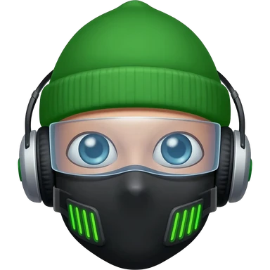 A human head wearing a green beanie and headphones ends connected by a clear visor. A black mask that is wide at the top and narrow at the bottom covers the lower face and has four glowing green vents on the front. emoji | AI Emoji Generator