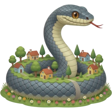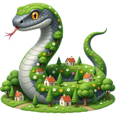 A snake that is gray and also flowers in grass on it in Giant and also that has houses and even villages on it in trees emoji