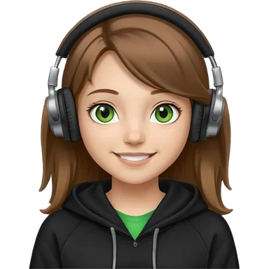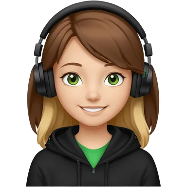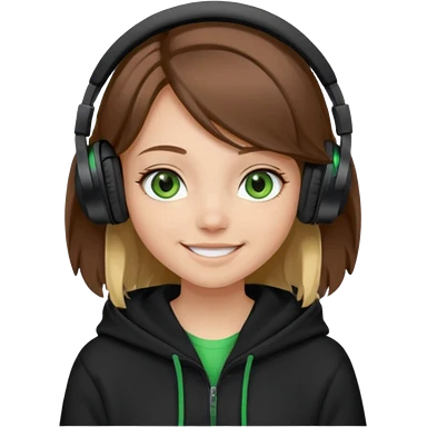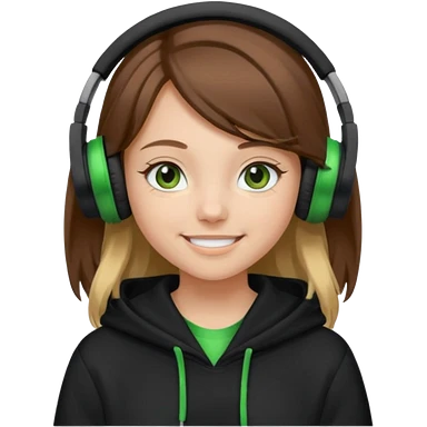 a girl with brown hair blonde ends green and wearing black headphones baggy hoddie she is happy emoji