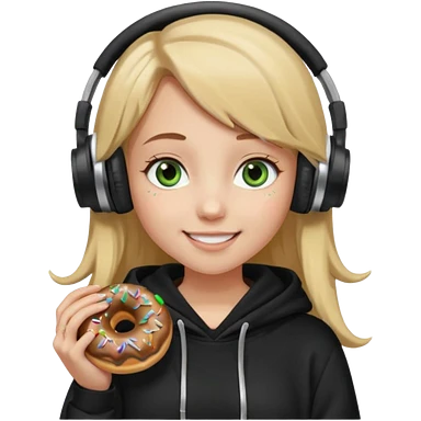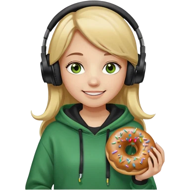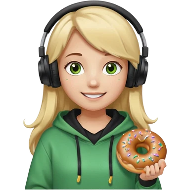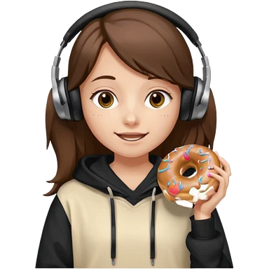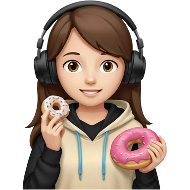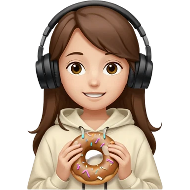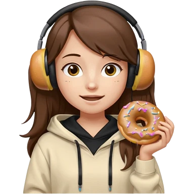 a girl with long brown hair green and wearing black headphones she is wearing a cream coulor baggy hoddie she is happyish holding a donut emoji
