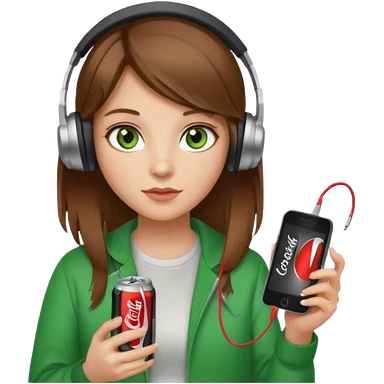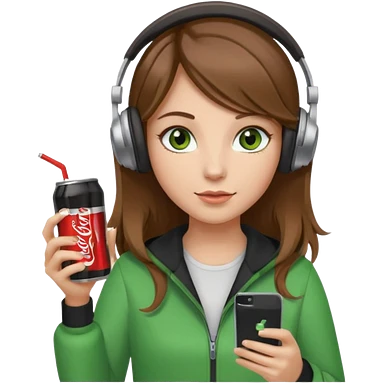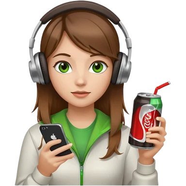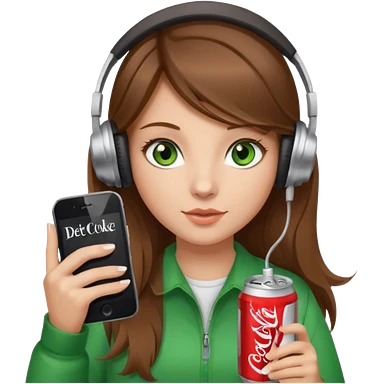 a girl with brown hair blonde ends green eyes phone in hand with diet coke and wearing headphones emoji