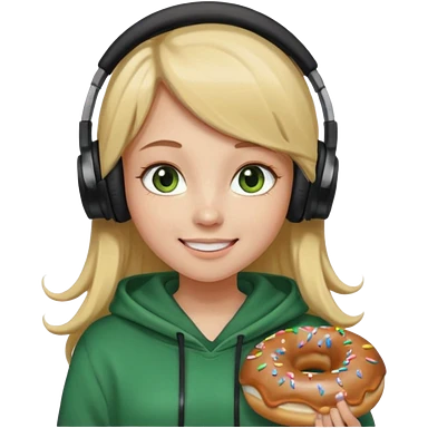 a girl with long brown hair blonde ends green and wearing black headphones she is wearing a cream coulor baggy hoddie she is happyish holding a donut emoji