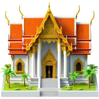 A miniature shopping mall with ornate Thai architecture, featuring distinctive multi-tiered peaked orange roofs, white stone walls, and gold filigree trim. Flanked by small tropical palm trees with a grand, wide-stepped entrance. emoji