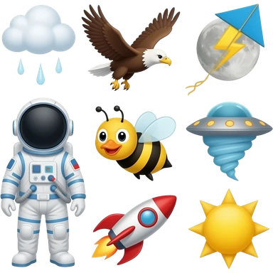 A is for Astronaut, balloon (hot air balloon), cloud, duck, eagle, fly (verb), glider, helicopter, ice (cloud), jet, kite, lightning, moon, Neptune, owl, plane, queen bee, rocket, star, tornado, ufo, Venus, wind, x-rays, yellow (sun), and zigzag emoji | AI Emoji Generator