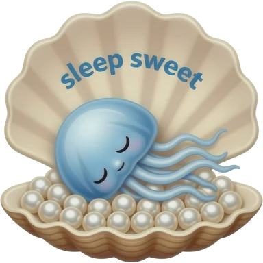The words "sleep sweet" are hovering over a jellyfish which is sleeping on a bed of pearls piled into a clam shell. emoji