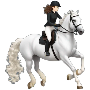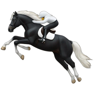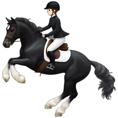 a JET BLACK HORSE JUMPING AN OBTACLE, THE HORSE HAS A WHITE BLAZE AND THREE WHITE SOCKS. tHE HORSES RIDER IS A YOUNG FEMALE WITH LONG CURLY BRUNNET HAIR emoji | AI Emoji Generator