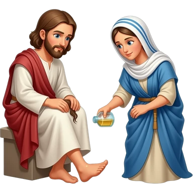A Jewish woman from Bible times pours the bottle of perfume on Jesus feet and rubbing her hair on his feet emoji