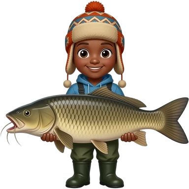 a black kid holding a massive catfish with a winter hat on and fishing waders emoji