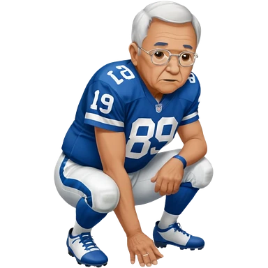 A grandpa playing football wearing an Indianapolis Colts jersey is. Show him kind of crouch down to the ground, holding the football and show back of his jersey. emoji