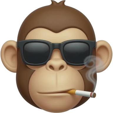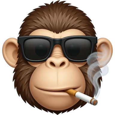 a monkey head which have thick eyebrow that was obvious, wearing a sunglasses which was in square shape, can see the big ear, nosehole, and big chin/mouth, in the monkey mouth was having a cigarette which have smoke come out emoji