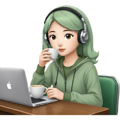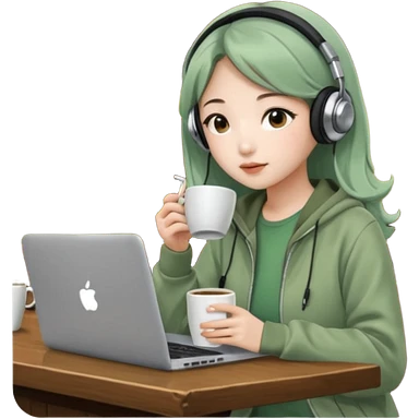 A Korean girl at a dive bar with a laptop and headphones with coffee watchin a korean drama the clothes in sage green emoji