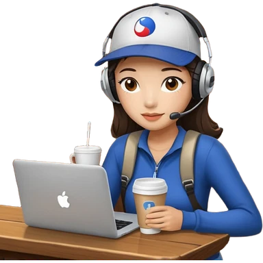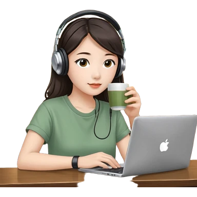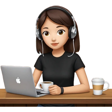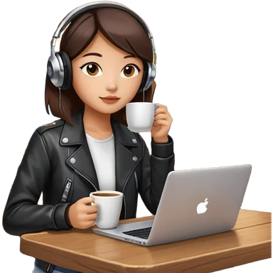 A Korean girl at a dive bar with a laptop and headphones on holding a cup of coffee emoji