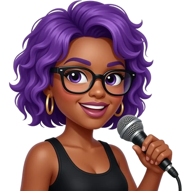 an afro singer lady hold a mic and wear eye glasses and her hairs in purple front view close up with half body emoji