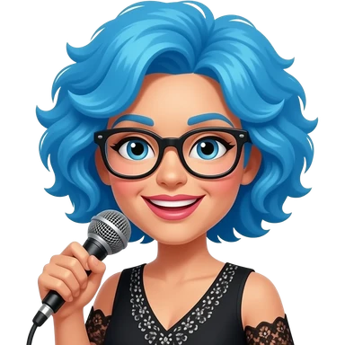 a lady singer in fluffly blue hairs hold a mic and wear glasses emoji