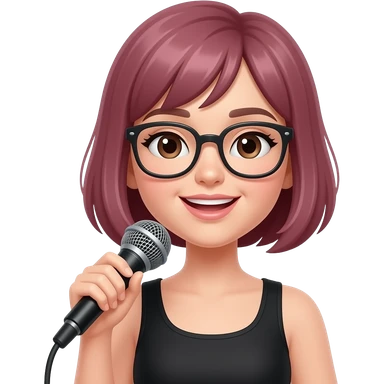 a girl singer with mehroon short hairs hold a mic and wear glasses emoji