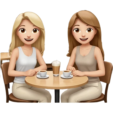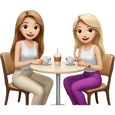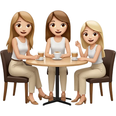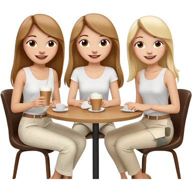 "Cartoon emoji of a girl with long, straight light brown hair, fair skin, brown eyes. Wearing a stylish white top and chic pants. Sitting at a café table, laughing and smiling, full of joy. Next to her, two friends: one blonde, one with black hair, one with brown hair. Smooth, simple, stylized emoji
