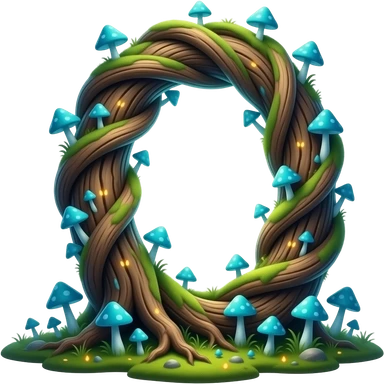 Magical letter 'A' formed from twisting ancient tree roots, overgrown with tiny neon-blue mushrooms and bioluminescent moss. Soft fireflies orbiting the letter, enchanted forest atmosphere, macro photography style emoji
