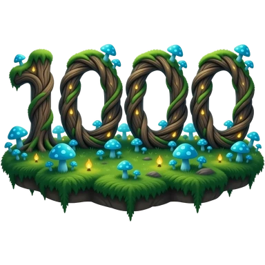 Magical number '1000' formed from twisting ancient tree roots, overgrown with tiny neon-blue mushrooms and bioluminescent moss. Soft fireflies orbiting the letter, enchanted forest atmosphere, macro photography style emoji