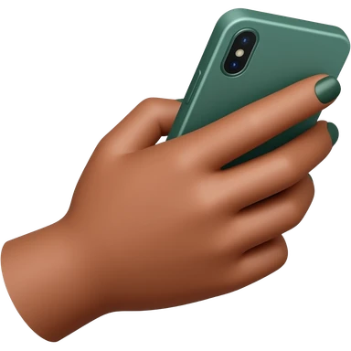 A light brown skinned female hand with thin fingers and dark green nails holds a dark green smartphone emoji