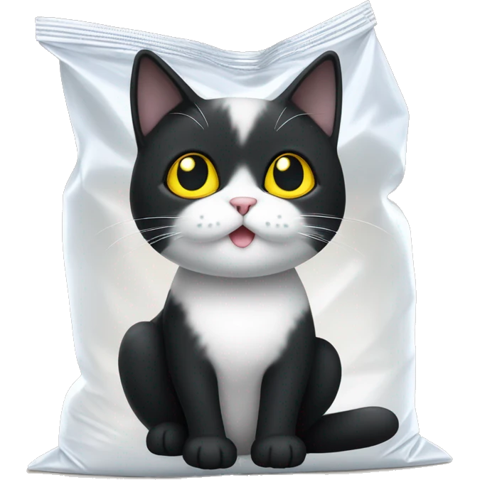 A little black and white cat sitting in a white plastic bag. The cat is mostly black except for white on her nose and paws. The cat has yellow eyes emoji | AI Emoji Generator